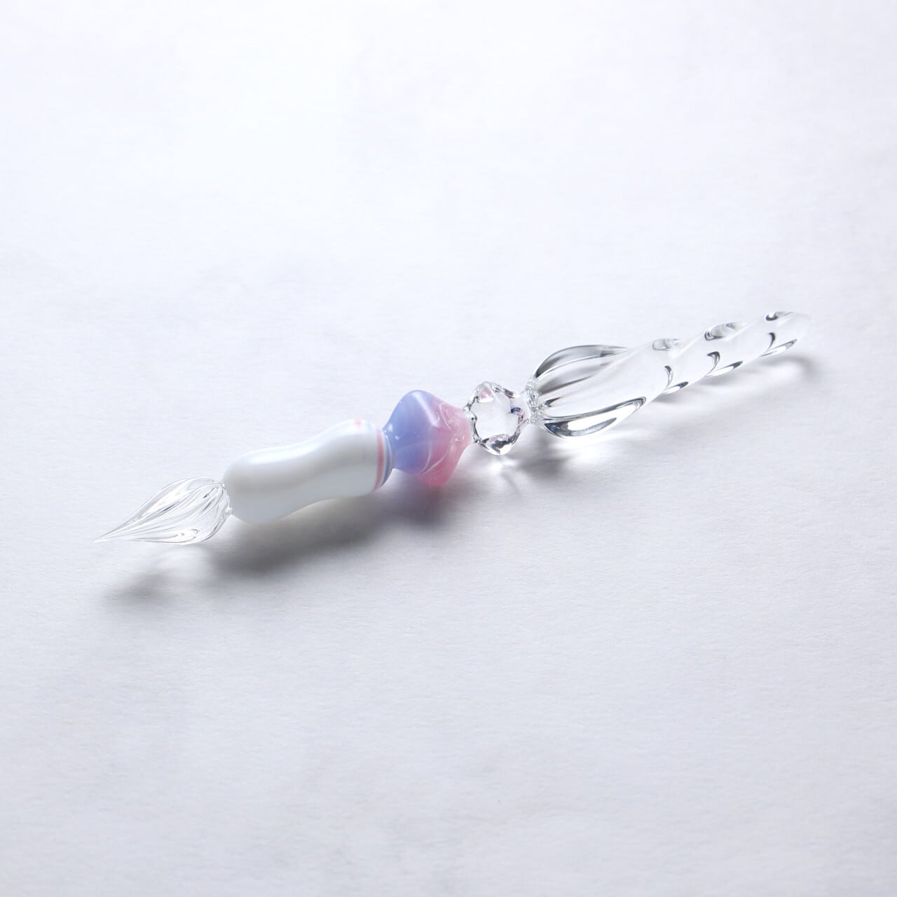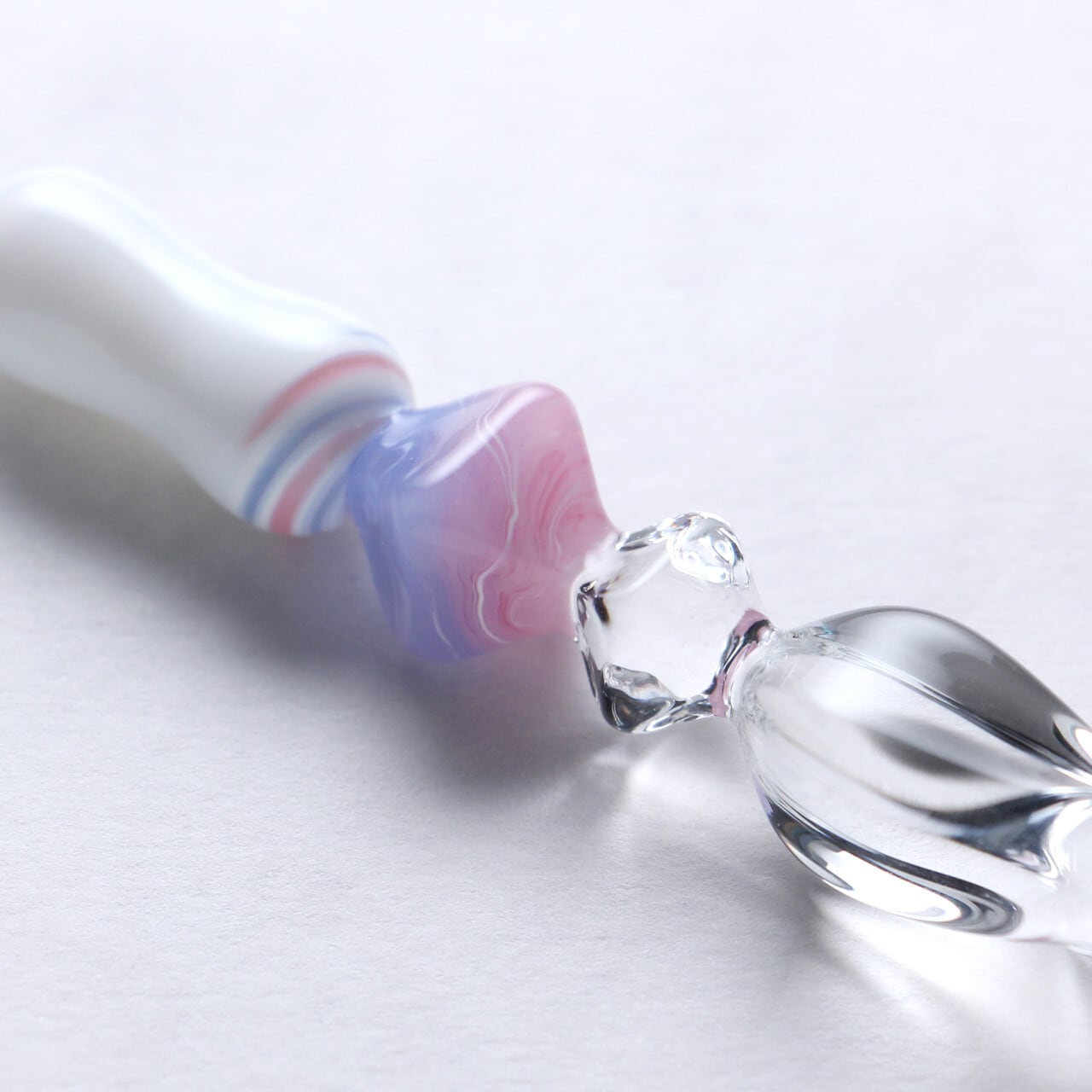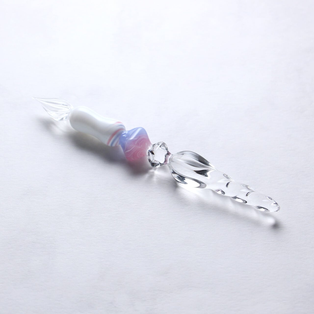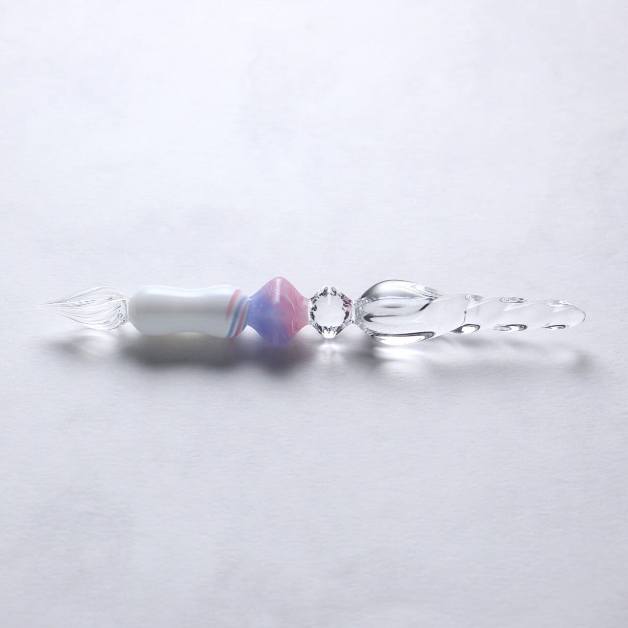 ローズクォーツセレニティは半透明ピンクと半透明ブルーにホワイトの線が層のように入っており、白いグリップの上部には宝石から滲み出たような二色のラインがアクセントとして螺旋状に描かれています